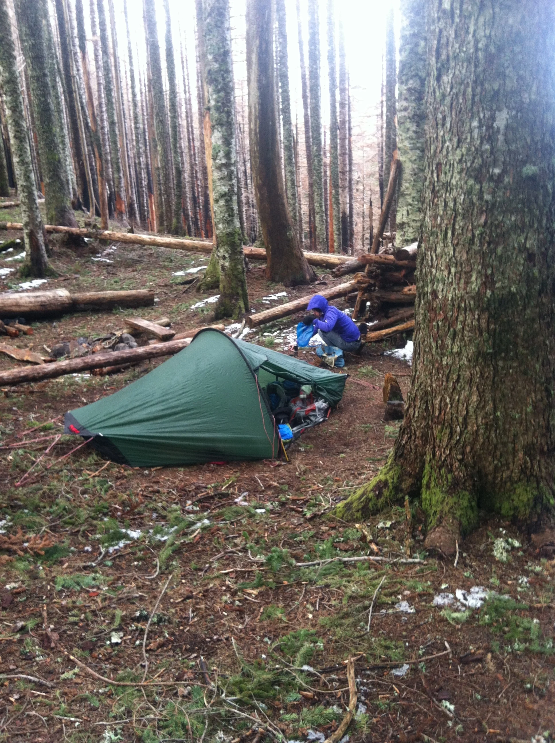 The way up the hill was absurdly steep. 3000' of elevation gain over three miles. Our daylight quickly depleted itself and we spent the last hour hiking in complete darkness. I was thankful to have just replaced the batteries in my headlamp. We somehow managed to not get lost at all. Although three miles up that steep a grade takes a lot longer than one would hope. We finally hit camp around 9:30pm, more than six hours after we set out.