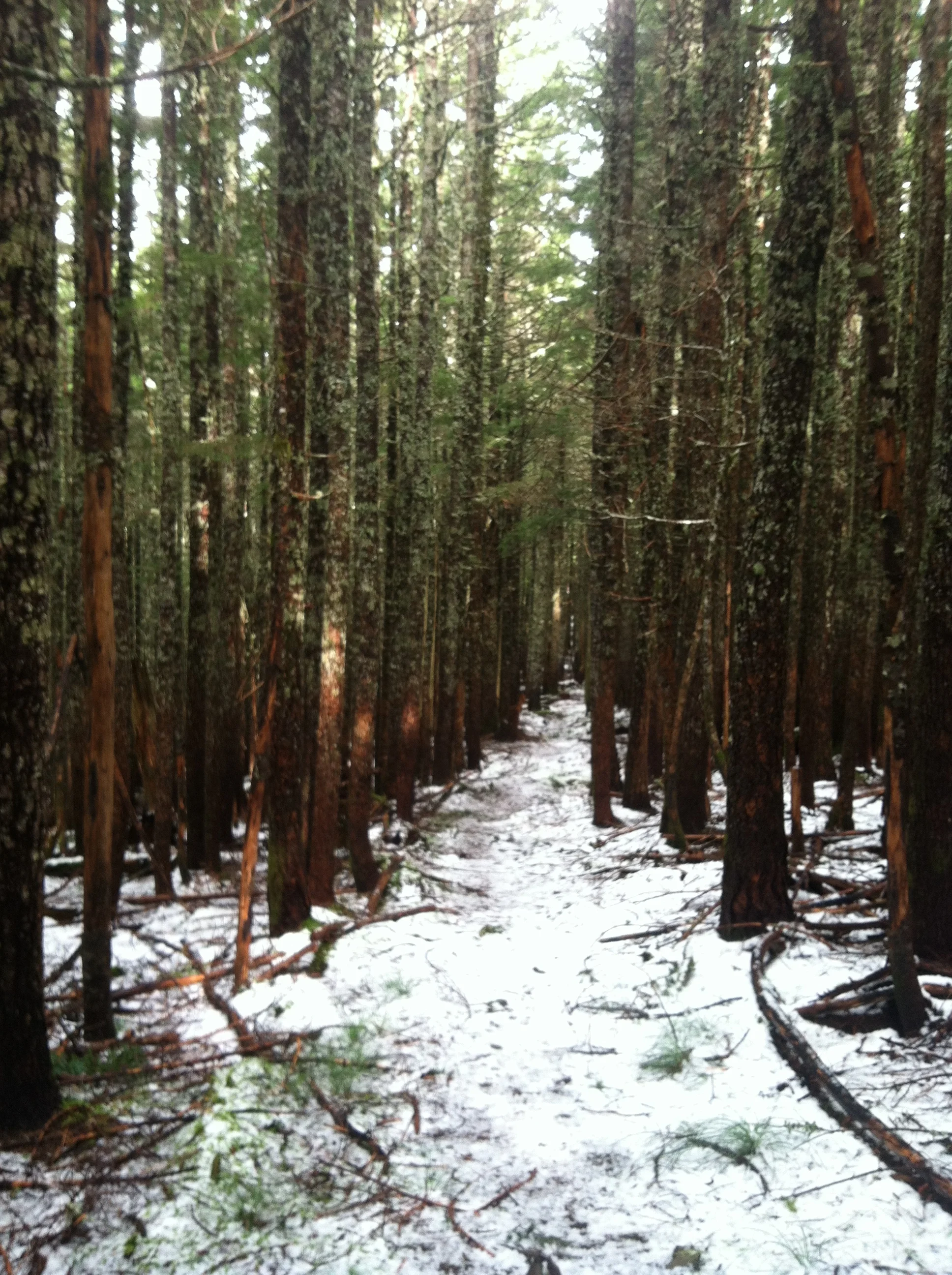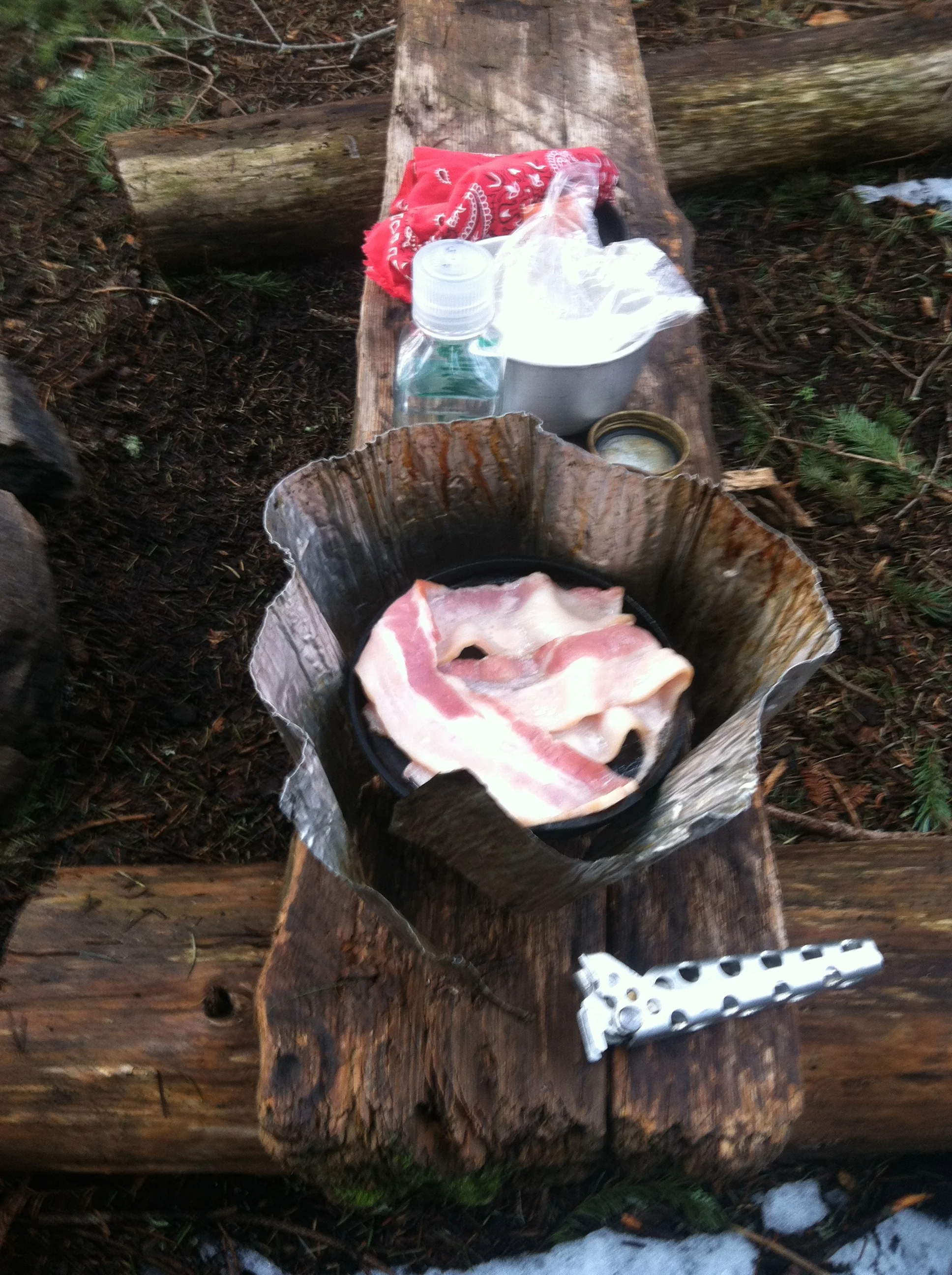 After a chilly night (it hit the low 30s that night) we had breaky (consisting of bacon, eggs, and tortillas), refilled our water out of the spring, and hiked on. We walked about a half mile on the PCT and then onto the Benson Way until we hit the Ruckel Creek Trail. It was obvious that not many people had come this way in a while. There was still a inch or so of snow on the ground up there at 4000' and the only tracks we saw until we crossed Ruckel Creek were from wildlife.